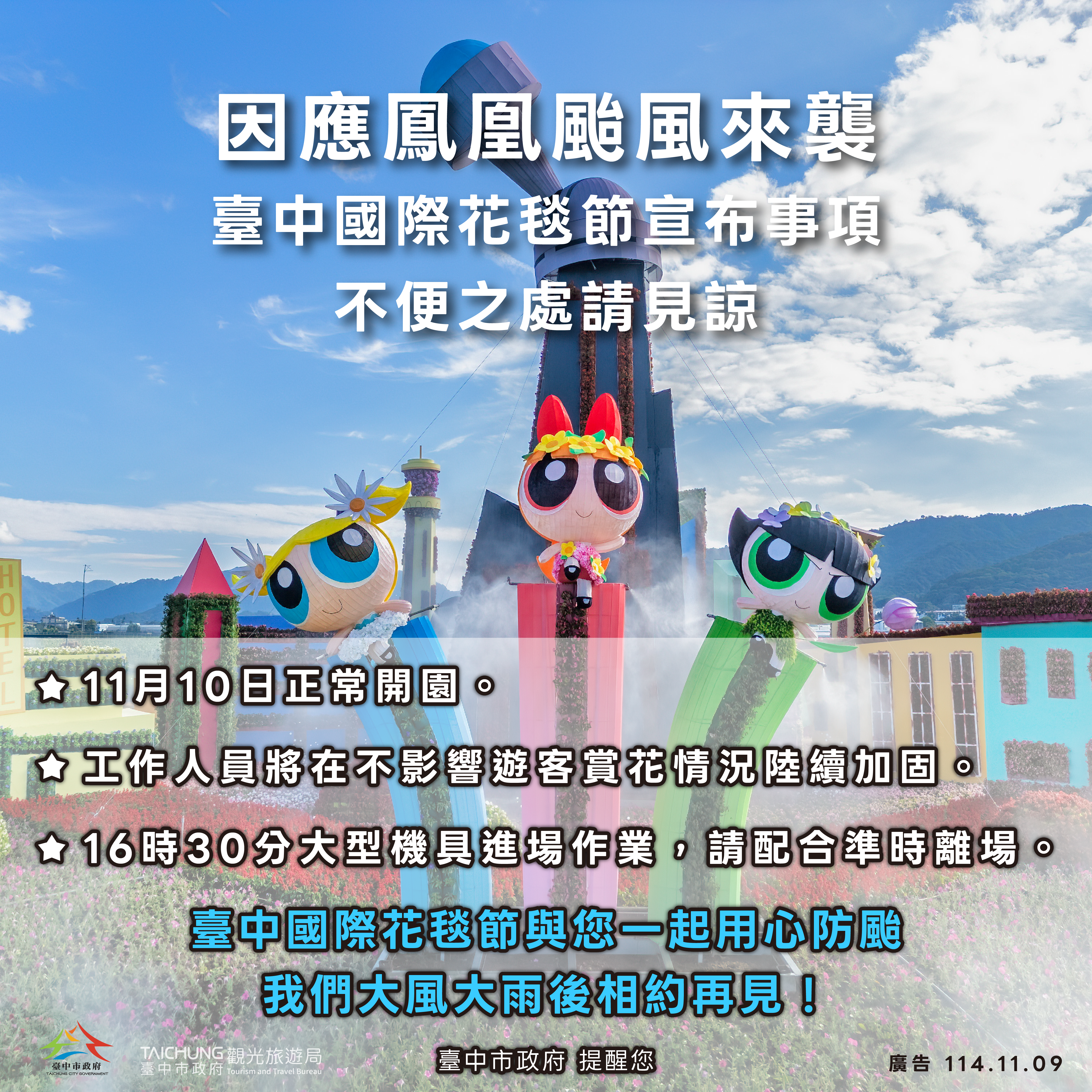 臺中國際花毯節與您一起用心防颱,我們大風大雨後相約再見!